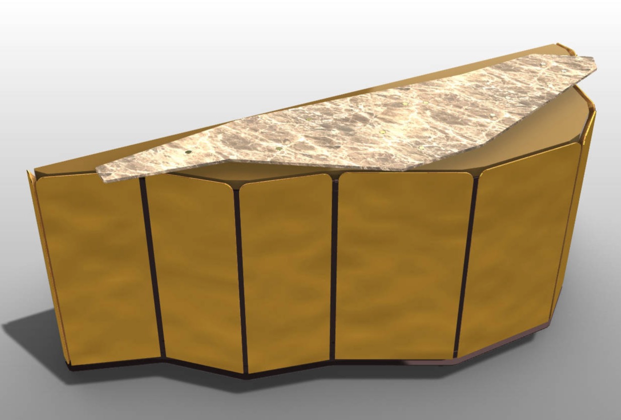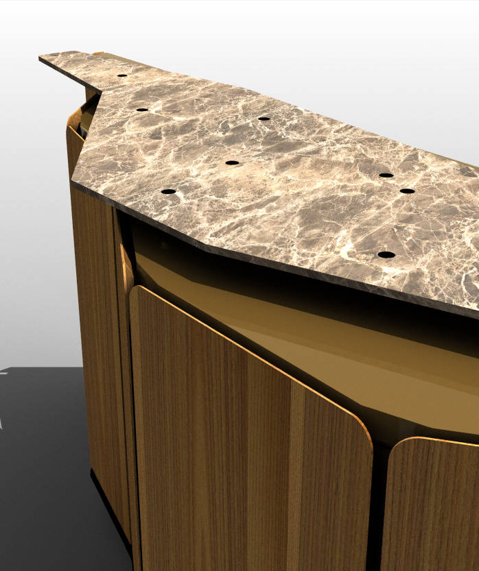 Product design: NOORMARKKU cupboard, different kind of marbles and wooden essences, with a metal structure and brass details, © copyright RAYSTUDIO 2021
