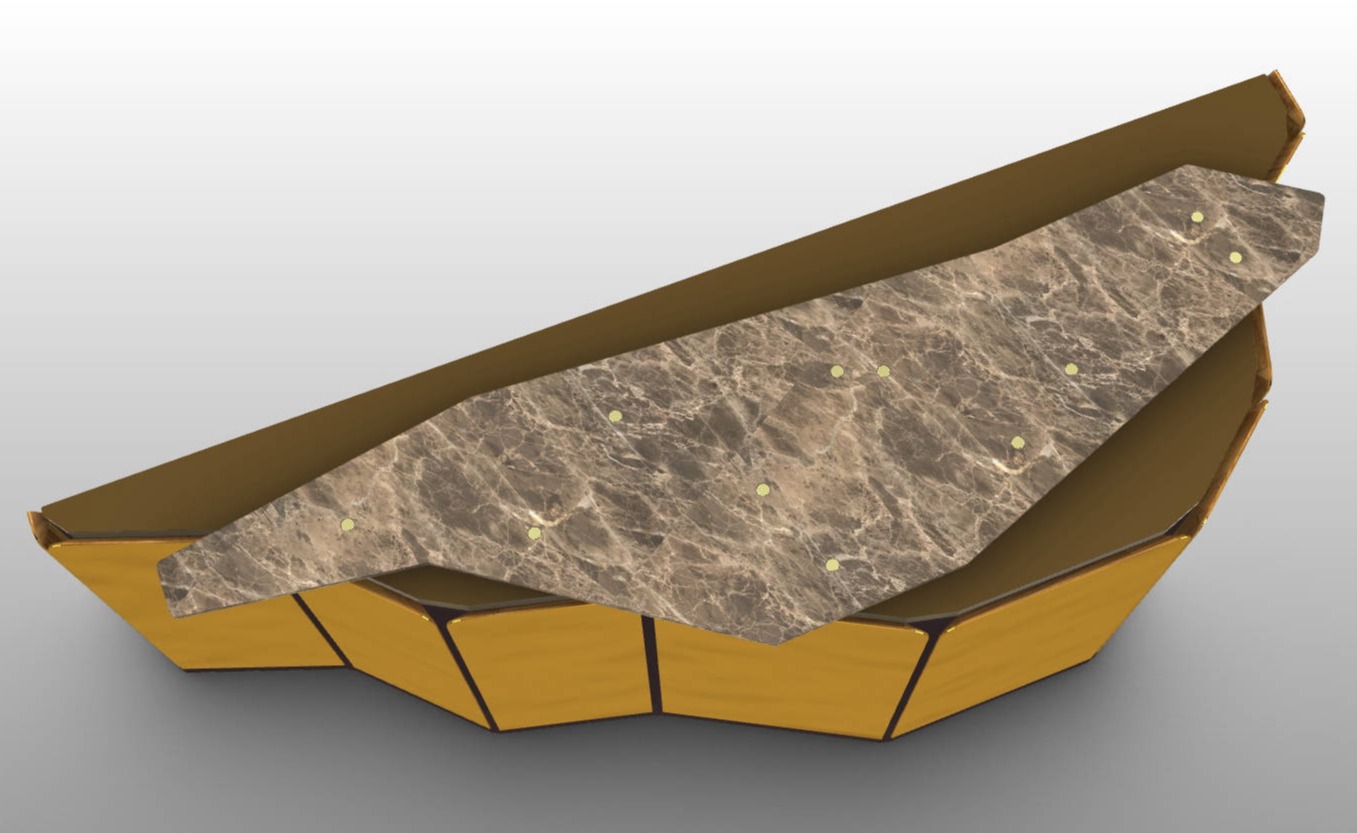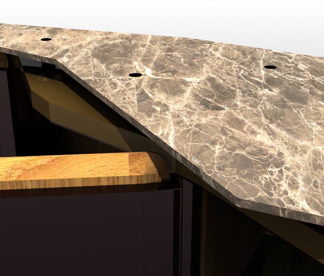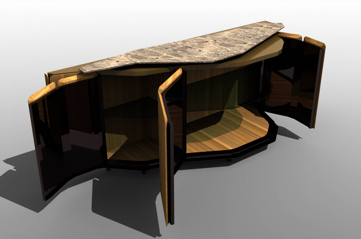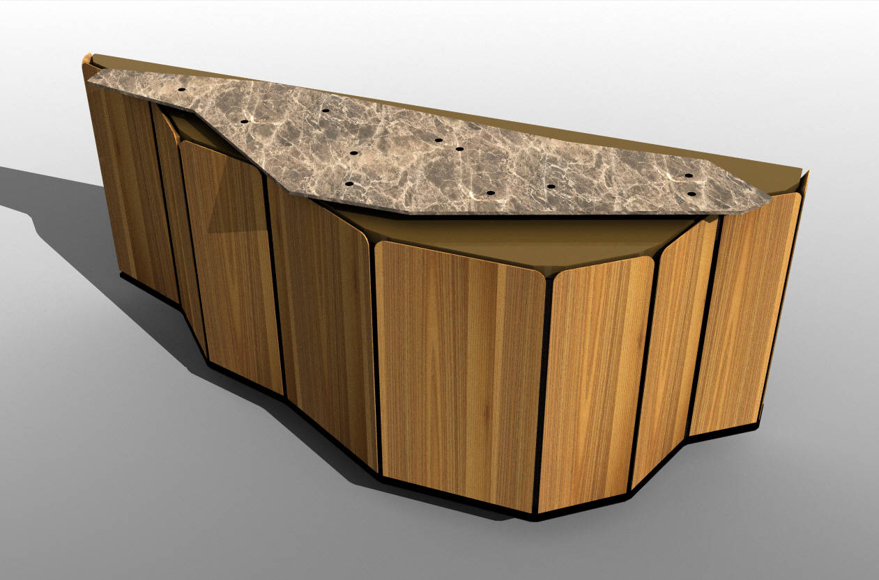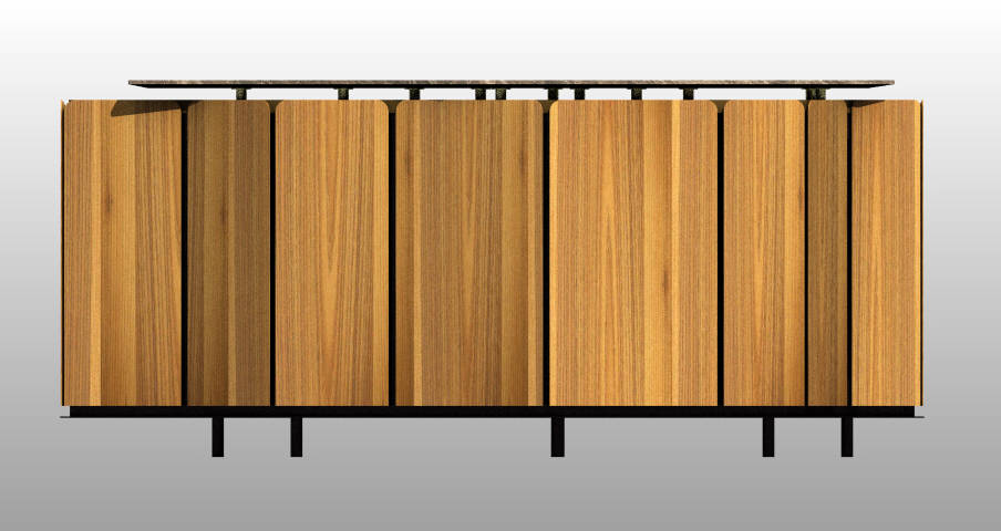 Product design: NOORMARKKU cupboard, different kind of marbles and wooden essences, with a metal structure and brass details, © copyright RAYSTUDIO 2021